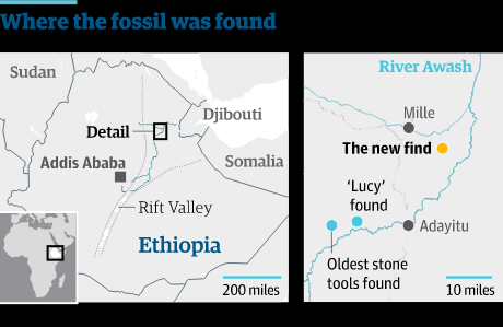 레디-게라루라고 불리는 곳에서 발견된 새로운 화석은 현생 인류의 조상으로 불리는 아우스트랄로피테쿠스 아파렌시스(Australopithecus afarensis)와 공통으로 가지고 있는 원시적 특징 몇 가지를 보여준다. 가장 잘 알려진 표본인 300만년 된 화석 루시는 1974 년에 레디-게라루와 40마일밖에 안 떨어진 하다르에서 발굴되었다. 하지만 이번에 발견된 화석은 더 현대적인 특징들도 가지고 있다. 어떤 특징은 사람 속에서만 발견되는 것으로, 이전의 화석들보다 위아래로 더 얕은 형태의 턱뼈가 그 예이다.