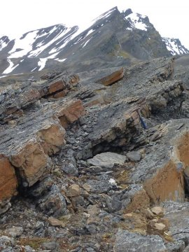 스피츠베르겐 페스트닝엔 단면에서 보이는 캅 스타로스틴 층의 모습니다. 가장 위쪽에 있는 세 개의 석회암층은 페름기 중기의 대량멸종을 기록하고 있다. 고위도 지역에서는 처음으로 발견된 기록이며 이것을 고려하면 페름기 중기 대멸종은 전지구적이었던 것으로 보인다. Credit: Photographer: Dierk Blomeier. For David P.G. Bond and colleagues, GSA Bulletin, 2015.