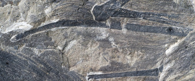 긴 막대 모양을 한 이 치의 오른손목뼈 (사진에서 가장 길게 보이는 것). 끝부분에 비막의 일부가 보존되어 있으며 깃털들이 많이 보인다. Photograph: Zang Hailong