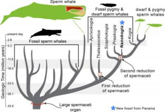 향유고래의 진화계통수로 멸종 및 현생 종들의 관계, 그리고 경랍기관의 축소가 언제 일어났는지를 보여주고 있다. Credit: Natural History Museum of Los Angeles County