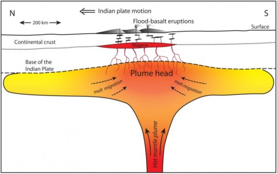 뜨거운 맨틀 플룸의 “머리” 부분이 인도판 아래에 팬케이크처럼 퍼져 있는 모습. 리차즈와 동료들의 이론에 의하면 이 플룸 머리 부분에 존재하고 있던 마그마가 칙술룹에 떨어진 소행성 충돌로 일어난 강력한 지진의 여파로 재기동되어 데칸 고원의 범람현무암 분출로 이어졌다고 한다. Credit: Mark Richards et al, UC Berkeley