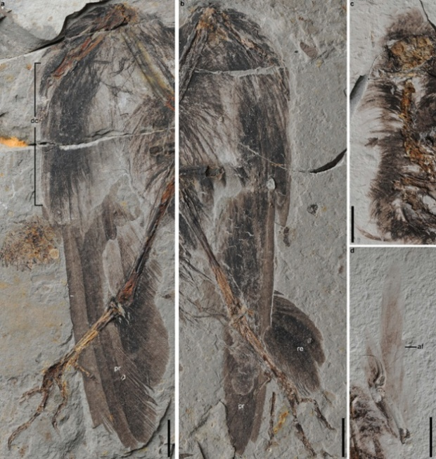 잘 보존되어 있는 새의 깃털. 왼쪽부터 시계방향으로 왼쪽 날개, 오른쪽 날개, 두개골 위의 장식깃과 목, 왼쪽 작은날개깃의 깃털. Photograph: Wang et al., Nature Communications