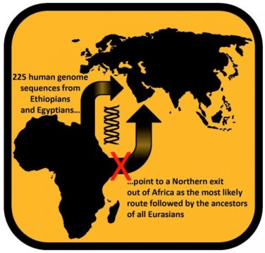 과학자들은 현생 인류의 조상이 아프리카에서 기원했다는 것에 확신을 가지고 있었지만 아프리카에서 이주해 나온 경로는 분명하지 않았다. 에티오피아와 이집트에 사는 사람들의 유전체를 새롭게 분석한 결과 이집트가 아프리카에서 이주해 나오는 주 관문이었으며 이주는 남쪽 경로보다는 북쪽 경로를 통해 이루어진 것으로 보인다. 이번 발견은 아메리카 인간유전학 저널 (AJHG, American Journal of Human Genetics) 5월 28일자 온라인 판에 실렸으며 인류의 과거 진화를 재구성하는 연구자들에게 큰 도움이 되는 정보이다.