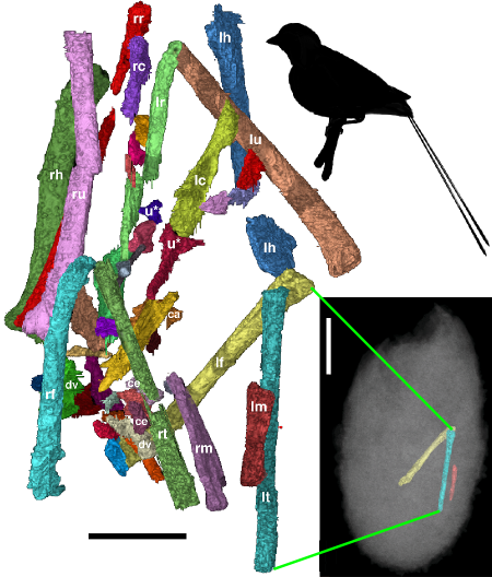 조류 뼈 픽업 스틱! 왼쪽에 보이는 것은 몽골의 새 알 내부의 뼈로 디지탈 처리를 거쳐 분리된 것이다. 오른쪽 아래에 보이는 것은 알 내부에 있는 왼쪽 뒷다리 뼈다 (윤곽선은 흐릿하다). 원래의 논문에서 넙다리뼈 (노란색) 은 윗팔뼈로 해석되었다. 오른쪽 위의 그림은 가까운 친척 관계인 백악기의 새, 프로톱테릭스 (PhyloPic.org 의 Matt Martyniuk 의 그림, CC-BY) 이다. 화석 이미지는 Varricchio et al. 2015 에서 수정을 가한 것. 스케일 바는 각각 5mm (왼쪽), 10mm (오른쪽).