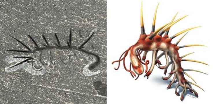 왼쪽: 버제스 셰일에서 발견된 할루키게니아 스파르사 (Hallucigenia sparsa). 표본번호 ROM 61513. 화석의 몸길이는 15mm. 오른쪽: 할루키게니아 스파르사의 복원도 Credit: Left: Jean-Bernard Caron; Right: Danielle Dufault