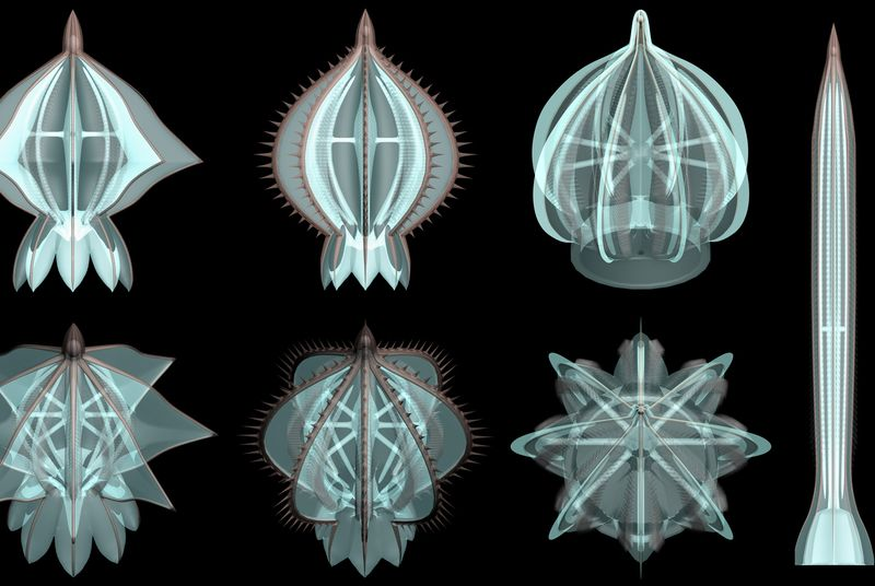 이번 연구에서 과학자들은 약 4억8500만년 전에 끝난 캄브리아기의 새로운 화석 여섯 종류를 살펴보았다. 이들은 빗해파리 몸통 위쪽에 감각기관을 둘러싸고 있는 여덟개의 단단한 판이 있다는 것을 발견했다. 이것은 중력 수용기로 사용되었다. 이 빗해파리들은 또 촉수를 가지고 있지 않았으며 사방으로 뻗어있는 여덟 개의 바퀴살 같은 구조를 가지고 있었다. 이 바퀴살들은 몸의 주요 부분을 구성하고 있는 연조직으로 된 덮개를 받쳐주는 역할을 했을 것으로 보인다.