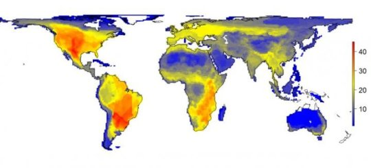 현생 인류 (호모 사피엔스) 가 끼친 충격이 없었을 경우 대형 포유류의 자연적인 다양성이 어땠을지를 보여주는 그림. 결과는 가로세로 각 100km 인 격자에 대형 포유류 (45kg 이상) 종의 수가 얼마나 되는지로 표시된다. 각 색깔이 나타내는 숫자는 오른쪽 척도에 나타나있다. Credit: Illustration: Soren Faurby