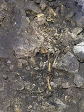유골은 커다란 석회암들로 잘 둘러쌓여 있었고, 세 개의 돌로 아이의 머리가 조심스럽게 보호되고 있었다. 이 무덤에서는 부장품들이 여기저기서 발견되어 아이가 특별한 지위를 가지고 있었으리라는 짐작을 할 수 있다. 유골은 여러 크기의 도기 파편들이 녹색 진흙으로 덮인 것이라든지 그릇 조각, 부싯돌, 뼈로 만든 화살촉, 규암 등 여러 종류의 물건들로 덮여 있었다. Credit: Eneko Iriarte