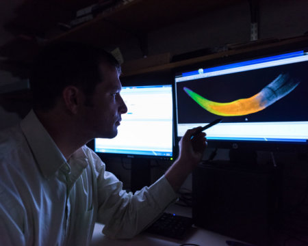 미시건 대학의 박사과정 학생인 마이클 처니가 색을 입힌 어린 털매머드 엄니의 CT 스캔 이미지를 보여주고 있다. 서로 다른 색깔은 성장연도를 나타낸다. Credit: Image courtesy of University of Michigan