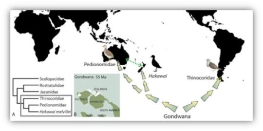 과학자들은 뉴질랜드 물떼새류의 하나인 하카와이 멜빌레이 (Hakawai melvillei), 오스트레일리아 떠돌이메추라기 (떠돌이메추라기과), 그리고 남아메리카 씨도요 (씨도요과) 가 모두 곤드와나 동부에서 기원했다고 생각한다. Credit: Image courtesy of Taylor & Francis