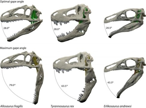 세 종류의 공룡이 턱을 벌릴 때 최적 각도와 최대각도. 알로사우루스 프라길리스, 티라노사우루스 렉스, 에를리코사우루스 안드레우시. Credit: Stephan Lautenschlager, University of Bristol