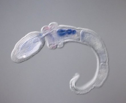 사코글로수스 코왈레브스키 (Saccoglossus kowalevskii) 의 어린 개체로 인두부에 전사인자가 발현된 것을 볼 수 있다. (파란색) Credit: Andrew Gillis