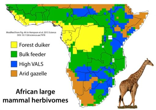 서로 다른 초식동물들의 종류들로 구성된 동물군 조성 및 풍부성 등을 분석하여 사하라 사막 이남의 아프리카를 네 가지 초식동물 구역 (herbivory regimes) 으로 나누었다. 이 생태구역은 숲, 사막, 영양이 풍부한 사바나, 그리고 영양이 부족한 사바나 계로 나누던 이전의 관점을 뒷받침해주고 있다. Credit: Dr Gareth Hempson