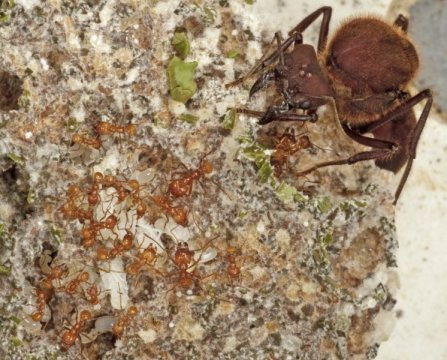 균류를 재배하는 개미 군집은 여러 몸크기를 가진 계급들 간의 분업이 이루어지는 복잡한 사회다. 위의 근접촬영 사진에서는 흰색 개미 애벌레를 돌보고 있는 자그마한 보모 개미와 대비되는 우상단의 거대한 여왕개미를 볼 수 있다. 이 개미들은 모두 지하에서 경작한 흰색 또는 회색의 균류가 만들어낸 단백질이 풍부한 먹이를 먹는다. 균류는 잎꾼개미가 개미 군집을 먹여살리기 위해 나무에서 따서 지하로 옮겨온 신선한 잎을 분해한다. Credit: Karolyn Darrow