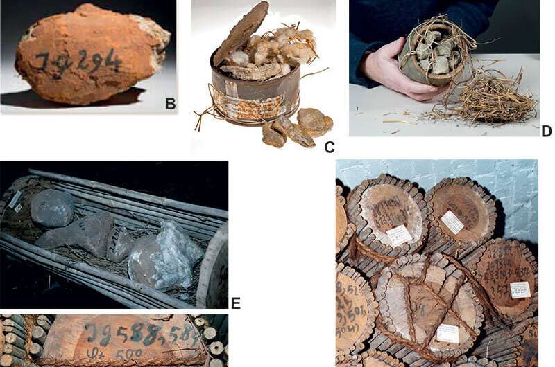 A) 야넨쉬(1909-1911)의 채석장 Ig/WJ 73페이지와 143페이지의 현장 카탈로그에 있는 항목. 채석장 Ig/WJ에서 원래 포장 된 품목의 사진. B) 점토 재킷 Ig294, C) 채석장 Ig/WJ의 작은 뼈로 채워지고 면 조각으로 채워진 깡통, B) 및 C)의 스케일바는 50mm. D) 사바나 풀 다발로 채워진 채석장 Ig/WJ의 작은 뼈와 척추로 채워진 바오밥 열매 캡슐, 축척하지 않음, E) 두꺼운 사바나 풀 층에 4 개의 점토 재킷 (일부는 파리 석고)이 들어있는 채석장 Ig/WJ의 열린 대나무 코르셋 (이 사진은 Heinrich and Schultka, 2007: Abb. 32), F) 원본 잉크 라벨과 종이 라벨이 보이는 MfN 컬렉션에서 연구 된 대나무 코르셋 중 하나의 클로즈업, E) 및 F)의 스케일바는 80mm. G) MfN 컬렉션에 보관 된 여러 대나무 코르셋의 단면. 사진 B)~E)는 카롤라 라드케, 사진 F)와 G)는 화자 괴츠, 모두 MfN. 크레딧: Palaeontologia Electronica (2023). DOI: 10.26879/1231. https://palaeo-electronica.org/content/2023/3747-bamboo-corsets-from-tendaguru