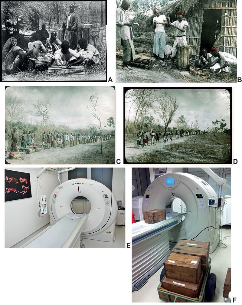텐다구루 언덕에서 대나무 코르셋을 포장하고 운반하는 사진, A) MfN HBSB PM_B_IV_0072, B) MfN HBSB PM_B_V_156, 대나무 코르셋을 제작하고 채우는 현지 노동자들, C) MfN HBSB PM_B_V_160, 대나무 코르셋을 들고 린디로 행진을 시작하기 위해 모인 노동자들, D) MfN HBSB PM_B_V_168, 대나무 코르셋을 양쪽에서 들거나 머리에 이고 린디로 향하는 작은 길을 따라 이동하는 짐꾼들. E) IZW의 Aquilion CX CT 스캐너, 이 기계는 40개의 대나무 코르셋을 모두 스캔하는 데 사용되었다. F) 채석장 Ig/WJ의 나무 상자가 샤리테의 도시바 아퀼리온 원(Aquilion One) CT 스캐너를 통과하는 중, 올리버 윙스의 사진. 크레딧: Palaeontologia Electronica (2023). 도이: 10.26879/1231. https://palaeo-electronica.org/content/2023/3747-bamboo-corsets-from-tendaguru